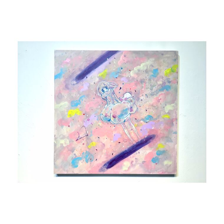 333×333mm 綿布、アクリル絵具、木パネル 2018 個展「煙に巻く」出品作品。若干13歳よりネットにて作品を発表し始めたきゃらあい。ペンタブから筆に移行した経緯はとても現代人らしいと言える。所謂イラストちっくでありながらもしっかりと絵画的技術も備えた若きアーティスト。今後の活躍にも大いに期待できる女性。