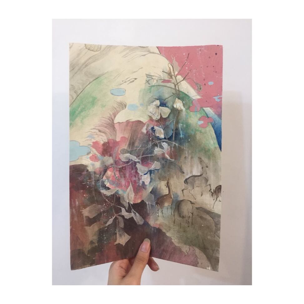 30×21㎝ 2017 和紙 日本画材 鉛筆 アクリル 昨年から二度の個展を経て作品にも厚みが出てきました。大学を卒業し、制作環境も変わる中で新たな作品に挑み続けます。画面にも奥行きを感じるようになりますます期待のアーティストです。 自身で制作した信貴山縁起絵巻模写作品に加筆した作品。