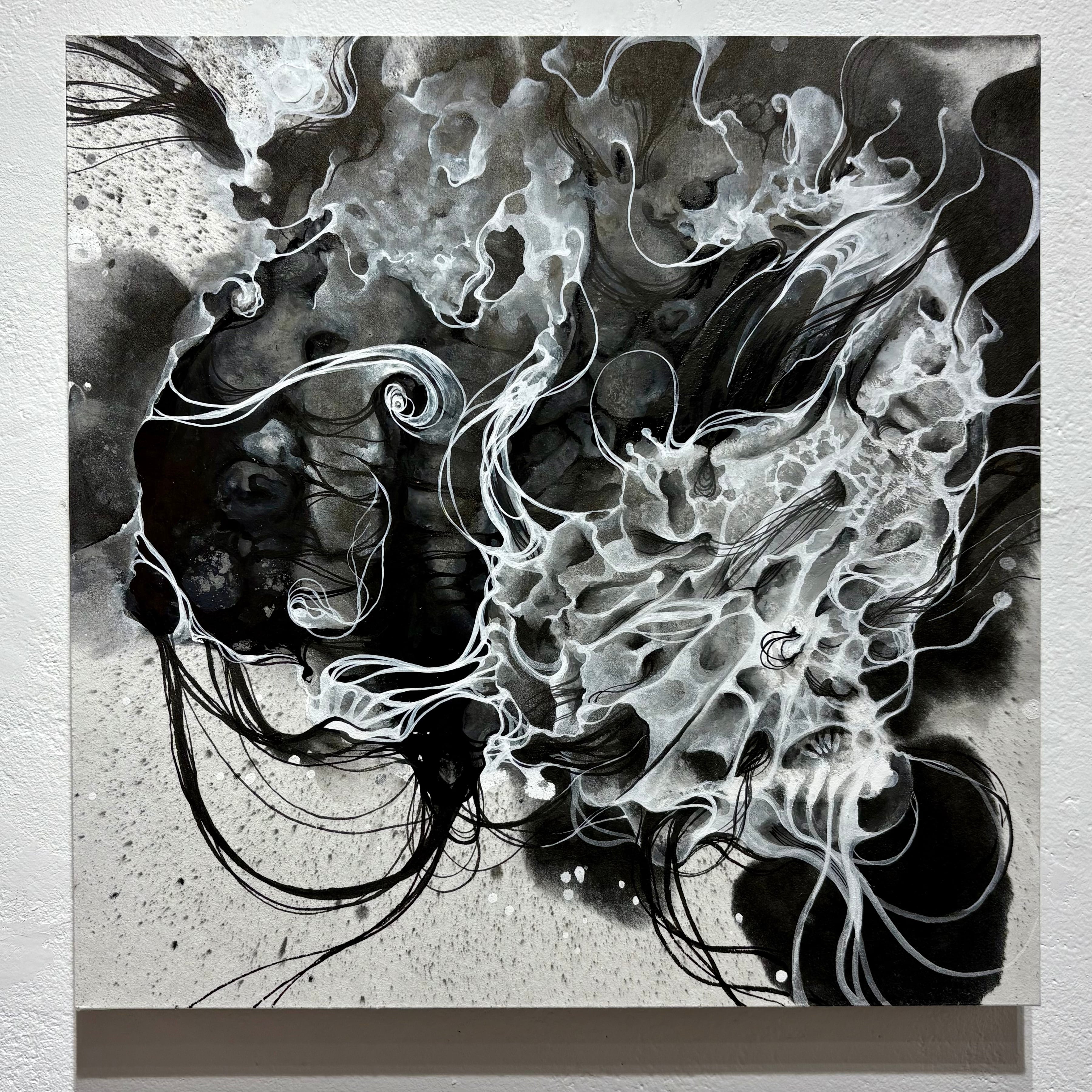 墨と胡粉、顔料等を使用し、偶発的にできた形に線を引くことで、なにかに成る過程のエネルギーの流動性を表現している。胎内で生命が形成されるように、偶然と必然の間を探ることで、人間だけがもつ孤独感はどこから発生するのかを描く "