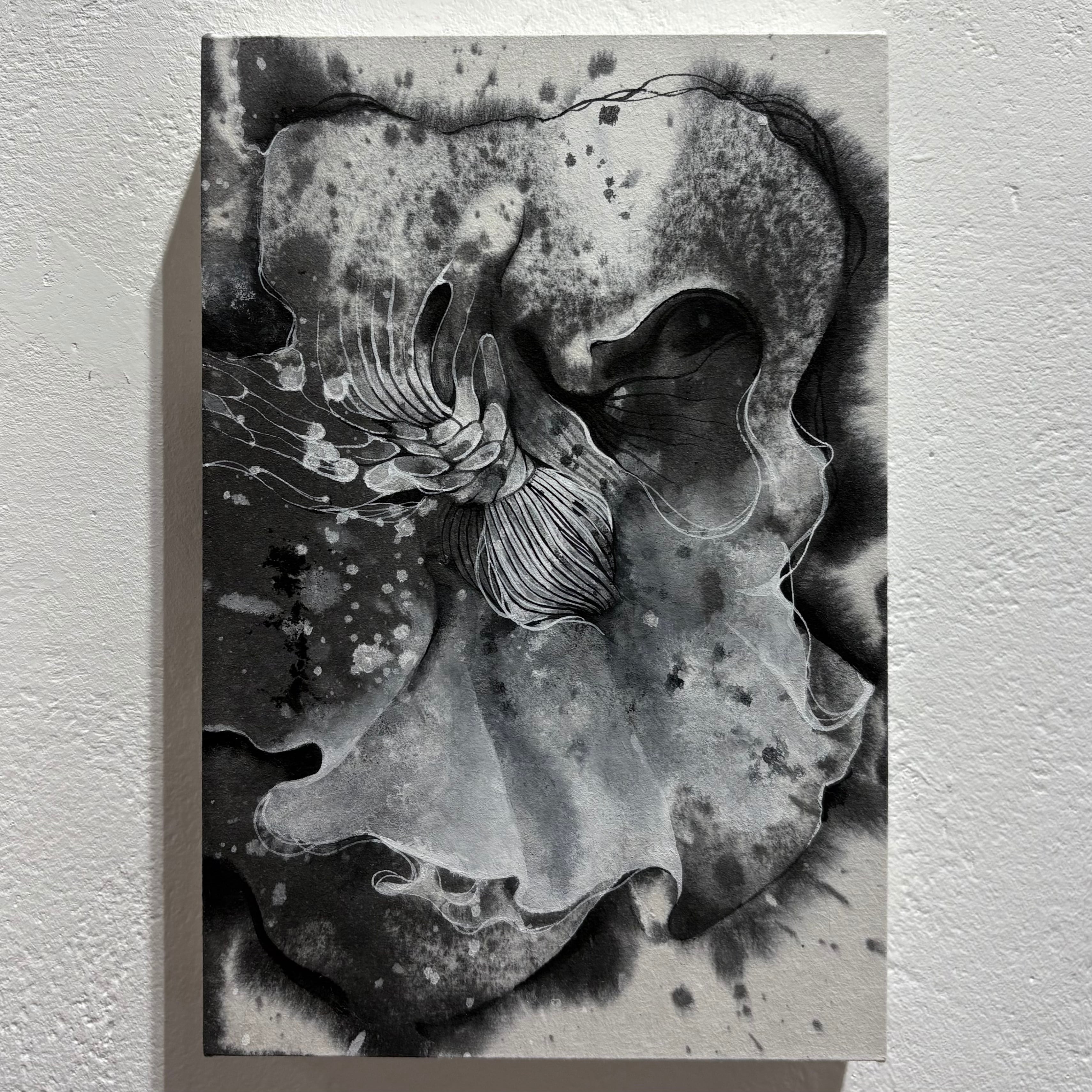 墨と胡粉、顔料等を使用し、偶発的にできた形に線を引くことで、なにかに成る過程のエネルギーの流動性を表現している。胎内で生命が形成されるように、偶然と必然の間を探ることで、人間だけがもつ孤独感はどこから発生するのかを描く "