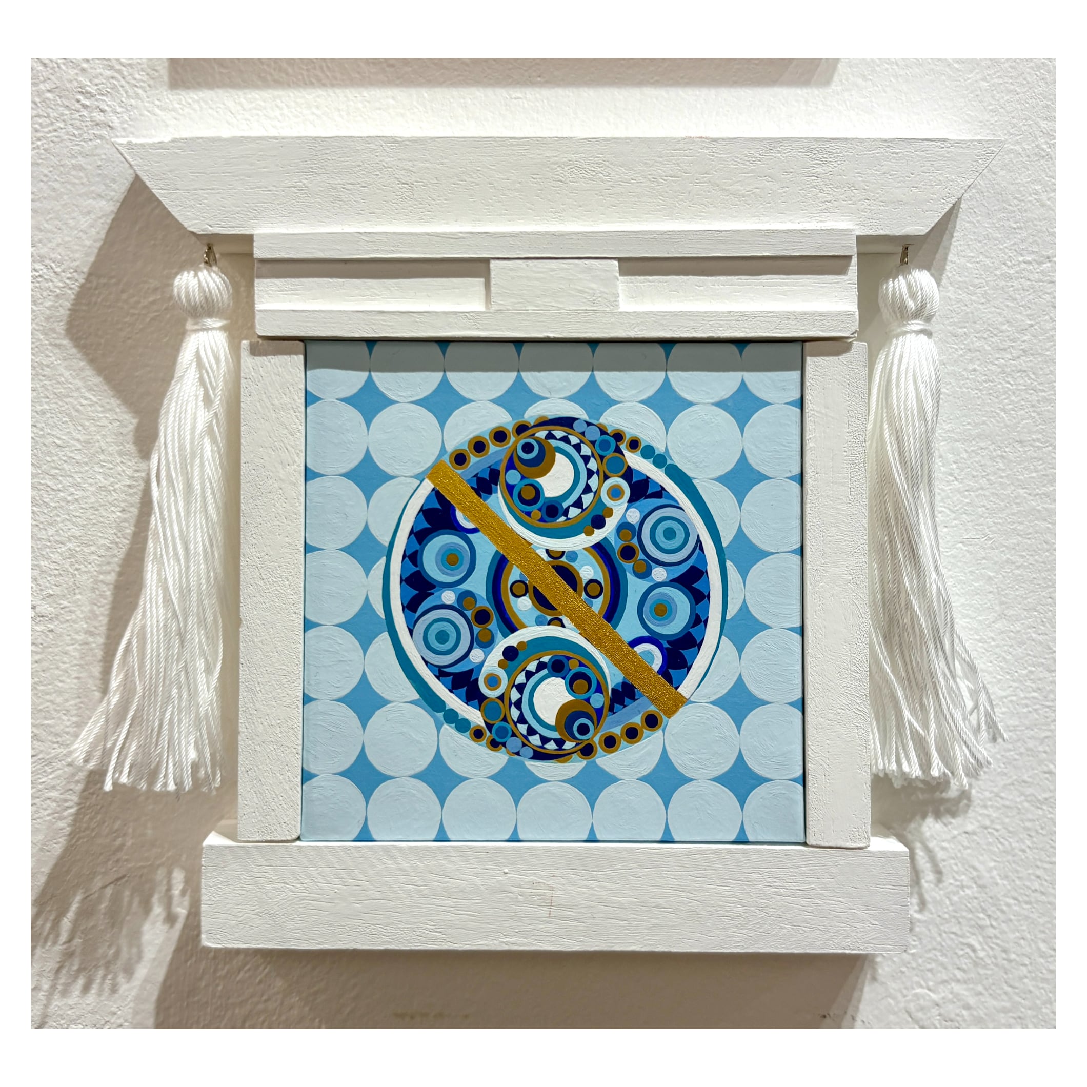 KASUMI 五戒 愚 KASUMI 五戒 愚 アクリル・木製パネル・ケント紙・角材・刺繡糸 164×180 2026 19800 https://x.com/Kasumi_54 KASUMI 円という図形を用いて形のないモノを描いています。 神様や信仰などに興味があり、モチーフやテーマに選ぶことが多いです。
