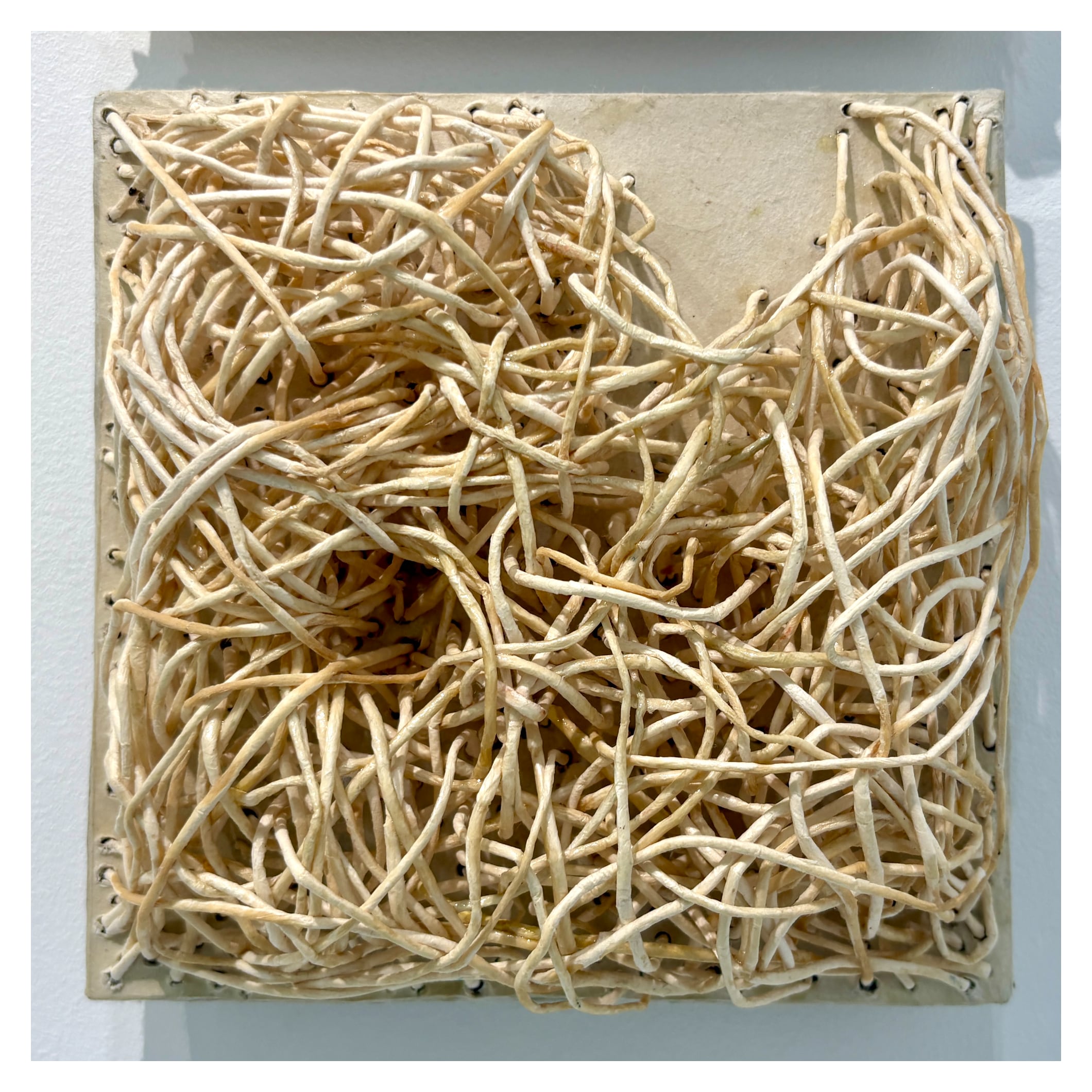 雁皮紙(和紙)と膠、一部糸を使って生命を生み出した。あえて色は封印。薄茶色は膠の色。ここまでやった和紙の造形をそれぞれ単独で使ってみた。実験的ではあるが、一つ一つの作品として作った。このようにして生み出された画面に生命感を感じ、自分も生き、生かされているというメッセージを込め、生命を表現した。具体的に今存在するものと、人類未確認生命体を行き来しながら制作している。まだ見たことのない唯一無二の世界の最初の目撃者になりたいと思っている。