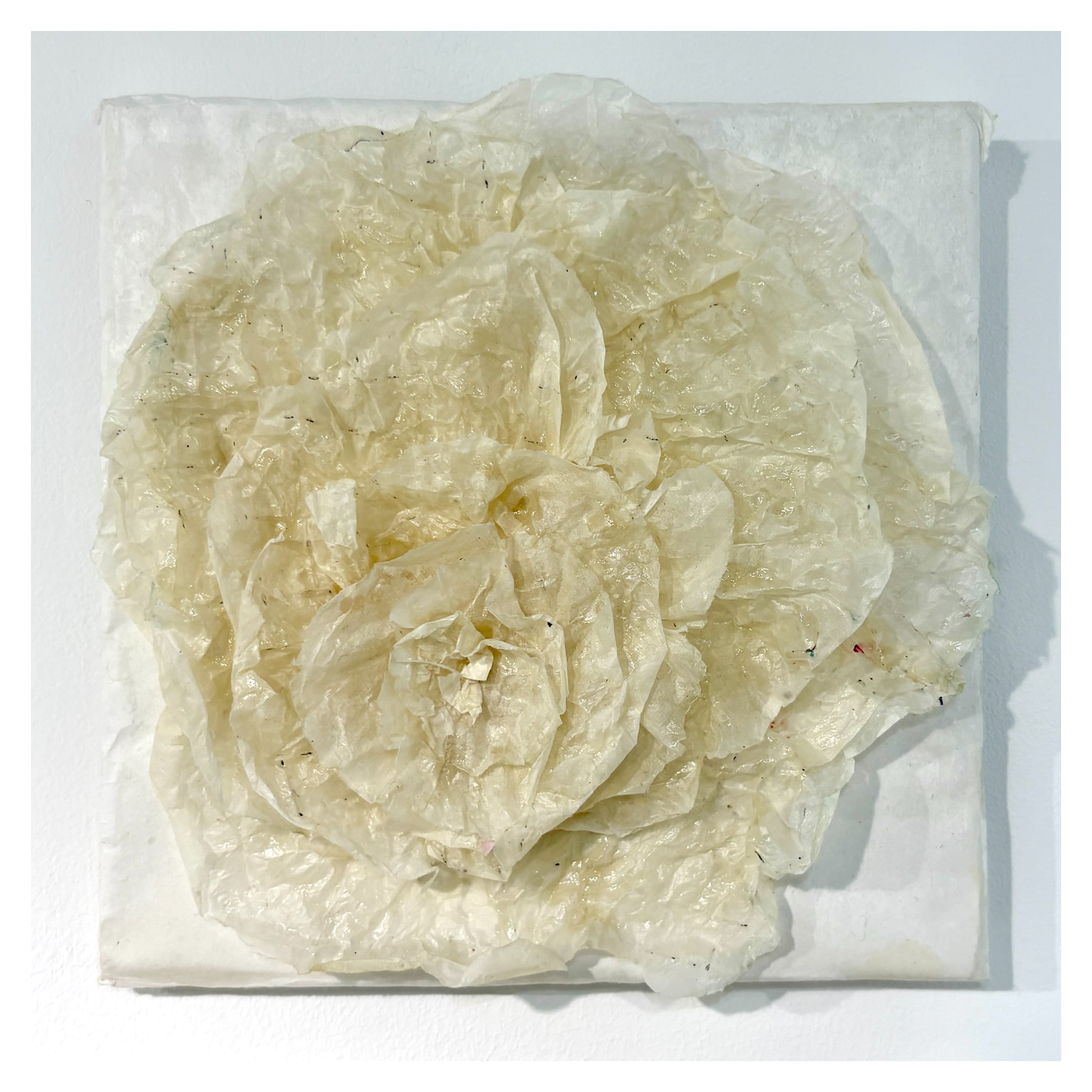 雁皮紙(和紙)と膠、一部糸を使って生命を生み出した。あえて色は封印。薄茶色は膠の色。ここまでやった和紙の造形をそれぞれ単独で使ってみた。実験的ではあるが、一つ一つの作品として作った。このようにして生み出された画面に生命感を感じ、自分も生き、生かされているというメッセージを込め、生命を表現した。具体的に今存在するものと、人類未確認生命体を行き来しながら制作している。まだ見たことのない唯一無二の世界の最初の目撃者になりたいと思っている。