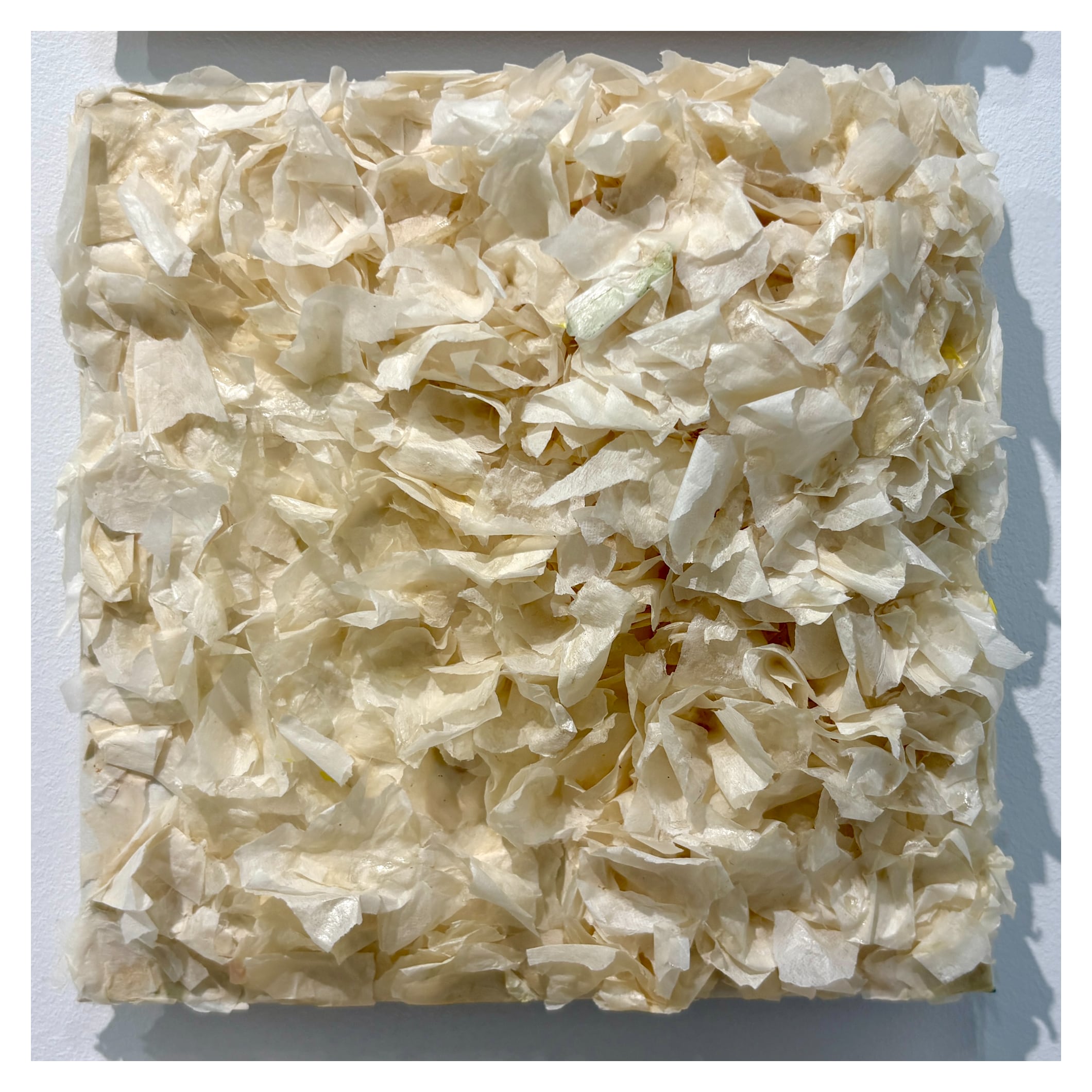 雁皮紙(和紙)と膠、一部糸を使って生命を生み出した。あえて色は封印。薄茶色は膠の色。ここまでやった和紙の造形をそれぞれ単独で使ってみた。実験的ではあるが、一つ一つの作品として作った。このようにして生み出された画面に生命感を感じ、自分も生き、生かされているというメッセージを込め、生命を表現した。具体的に今存在するものと、人類未確認生命体を行き来しながら制作している。まだ見たことのない唯一無二の世界の最初の目撃者になりたいと思っている。