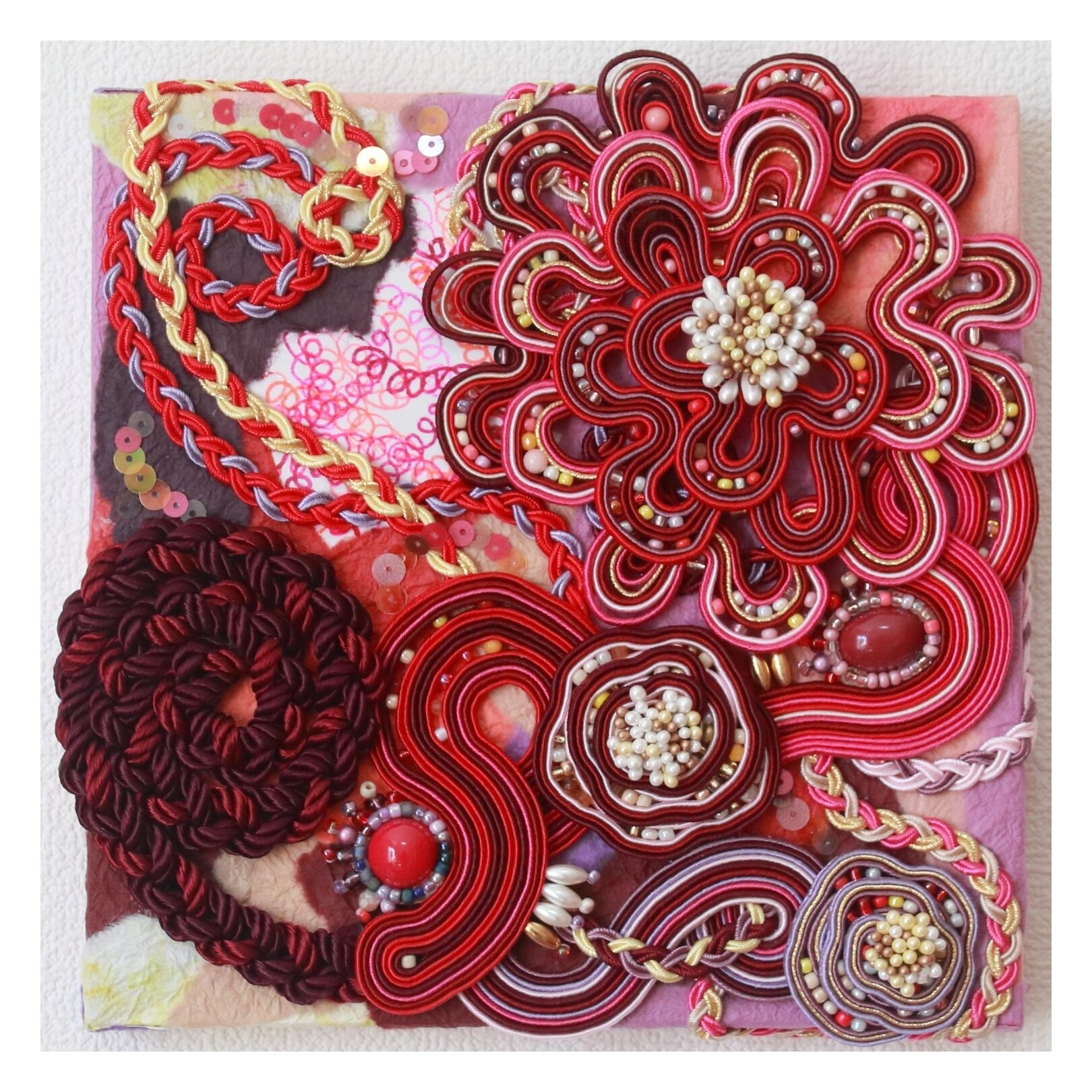 紐類、ビーズ類、和紙、ペップ、インク、木製パネル190×188mm