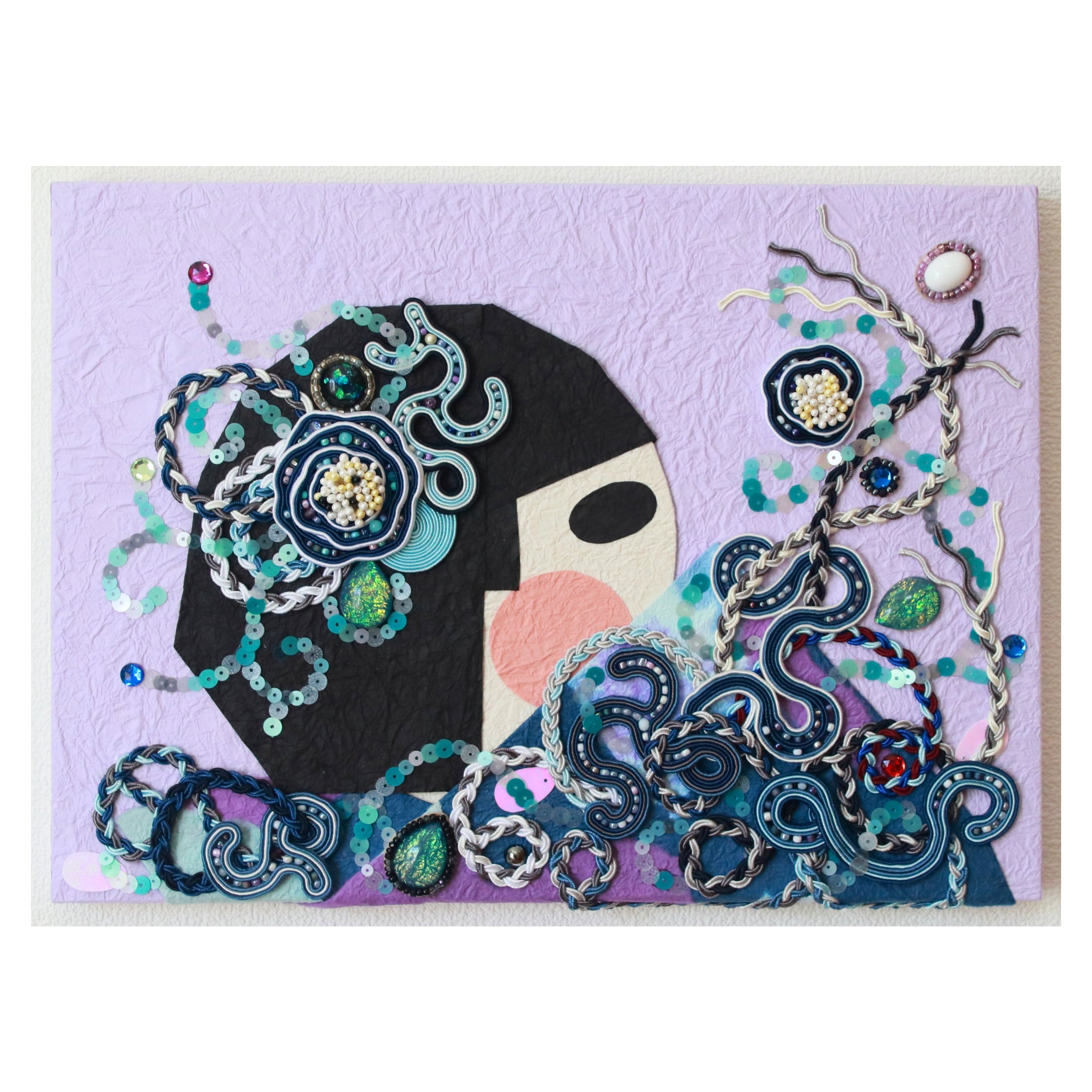 紐類、ビーズ類、和紙、厚紙、ペップ、木製パネル245×333mm