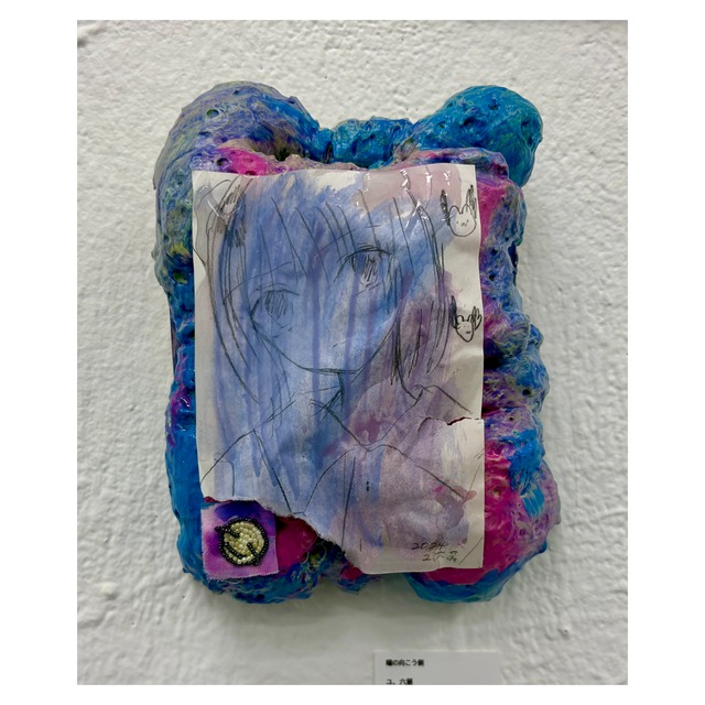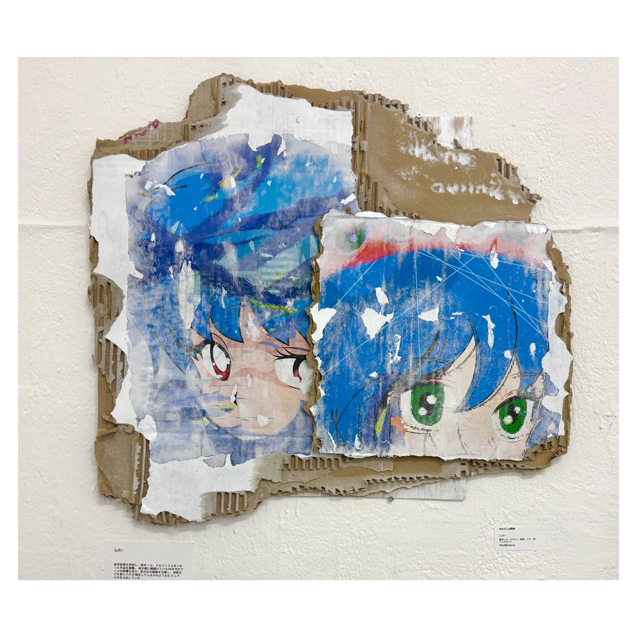 まなざしの残滓 レパー 段ボール、スプレー、転写、ニス、UVトップコート560×515mm 22000 転写技術を利用し、段ボール、アルミニウムをつかった作品を展開。 幼少期に観続けていた90年代のアニメの影響を受け、美少女の図像を分解し、溶剤などを使いバグが発生しているかのようなビジュアルを生み出している @leper_kamilah (X/Instagram ) https://b-conumi.tumblr.com/