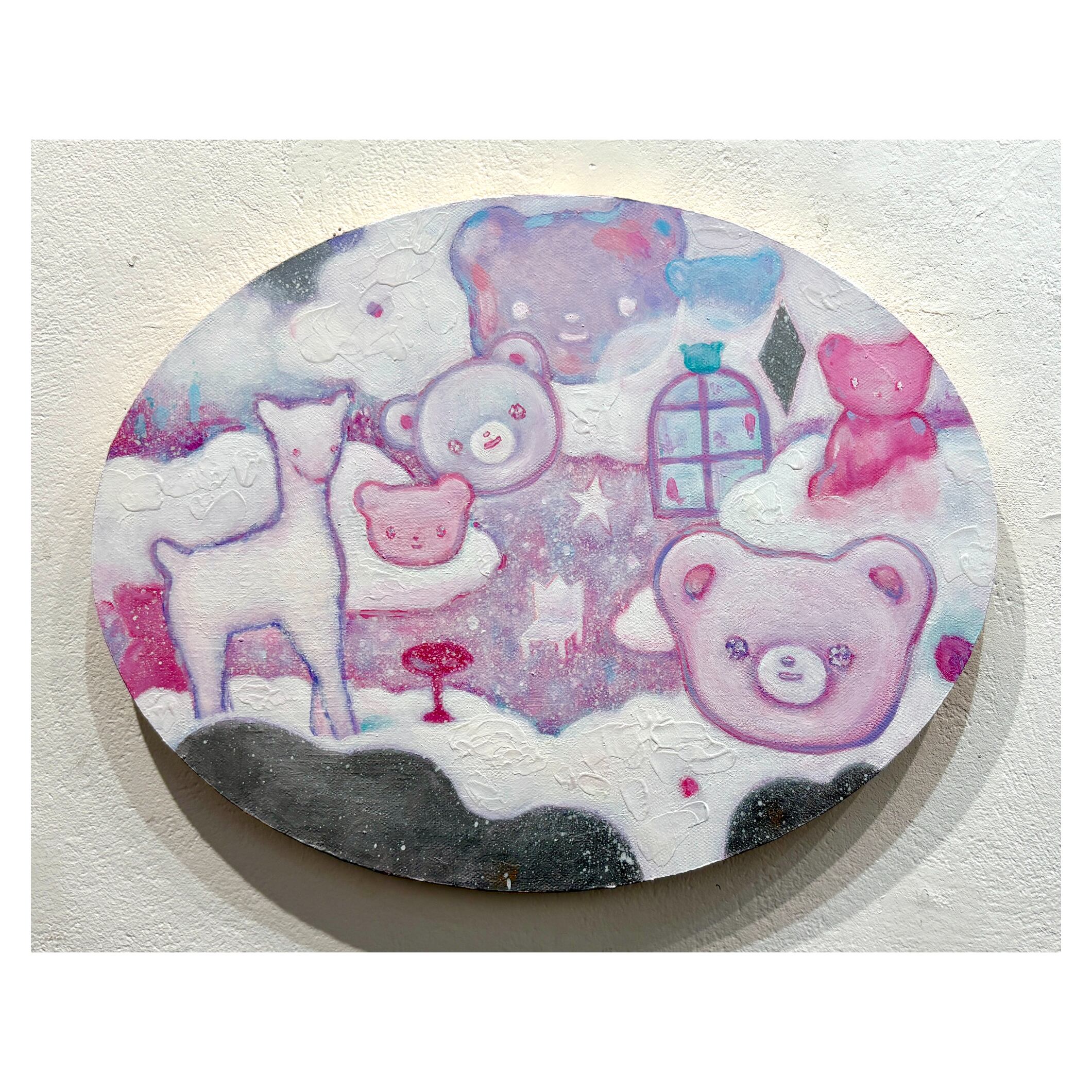 ぬいぐるみやお菓子など、幼少期の記憶に眠るモチーフが少女を取り囲み、