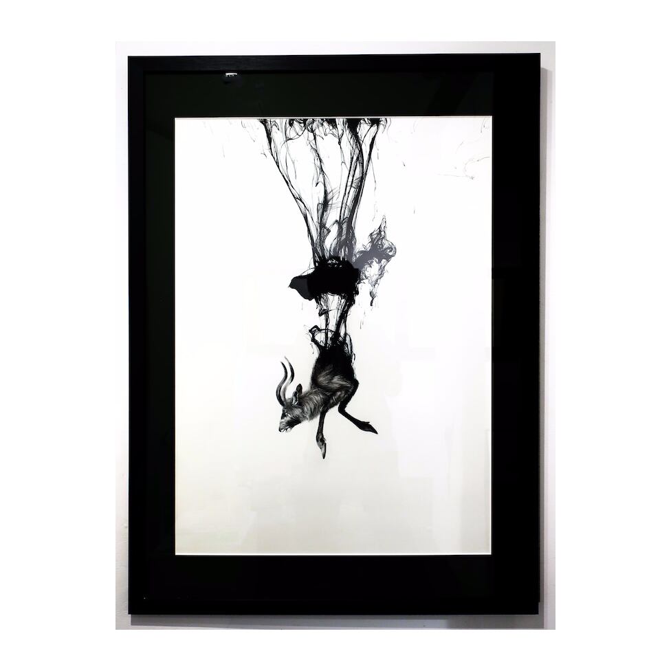 主にチャコールペンシルを使い、インクが水中で漂う様と動物をモチーフに描くモノクロームの世界。