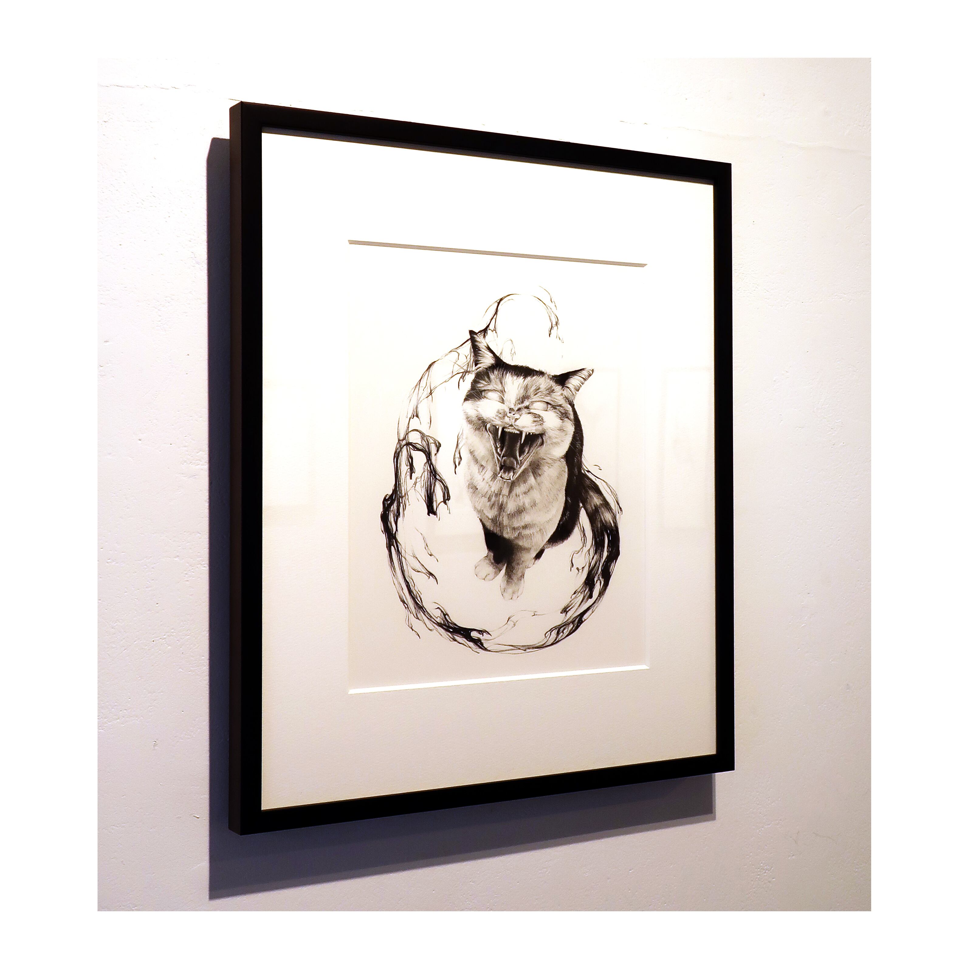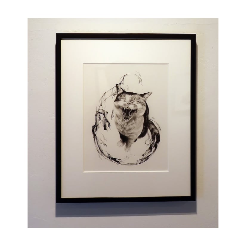 主にチャコールペンシルを使い、インクが水中で漂う様と動物をモチーフに描くモノクロームの世界。