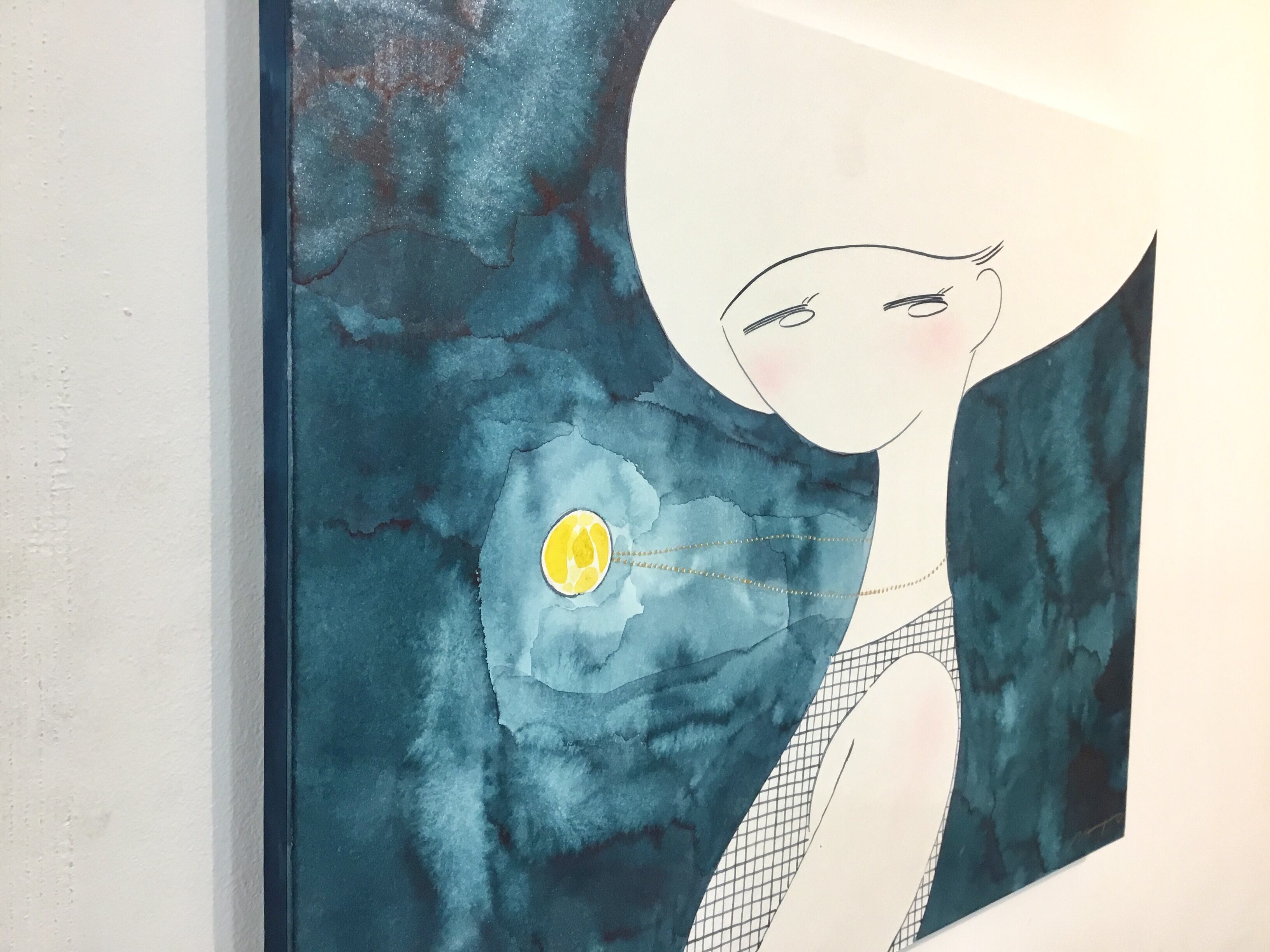 410×318mm 水彩・紙・木製パネル イラストレーションとコラージュ技法の制作スタイルを行き来するアーティスト、サトウナツキのイラストレーション寄りスタイルの作品。抜群のセンスで描かれた女性像。線による描き込みを極力抑え、水彩のグラデーションや奥行きを感じさせる着彩は見事なもの。僅かに使われたパールやラメの質感は是非直接ご覧頂きたい。