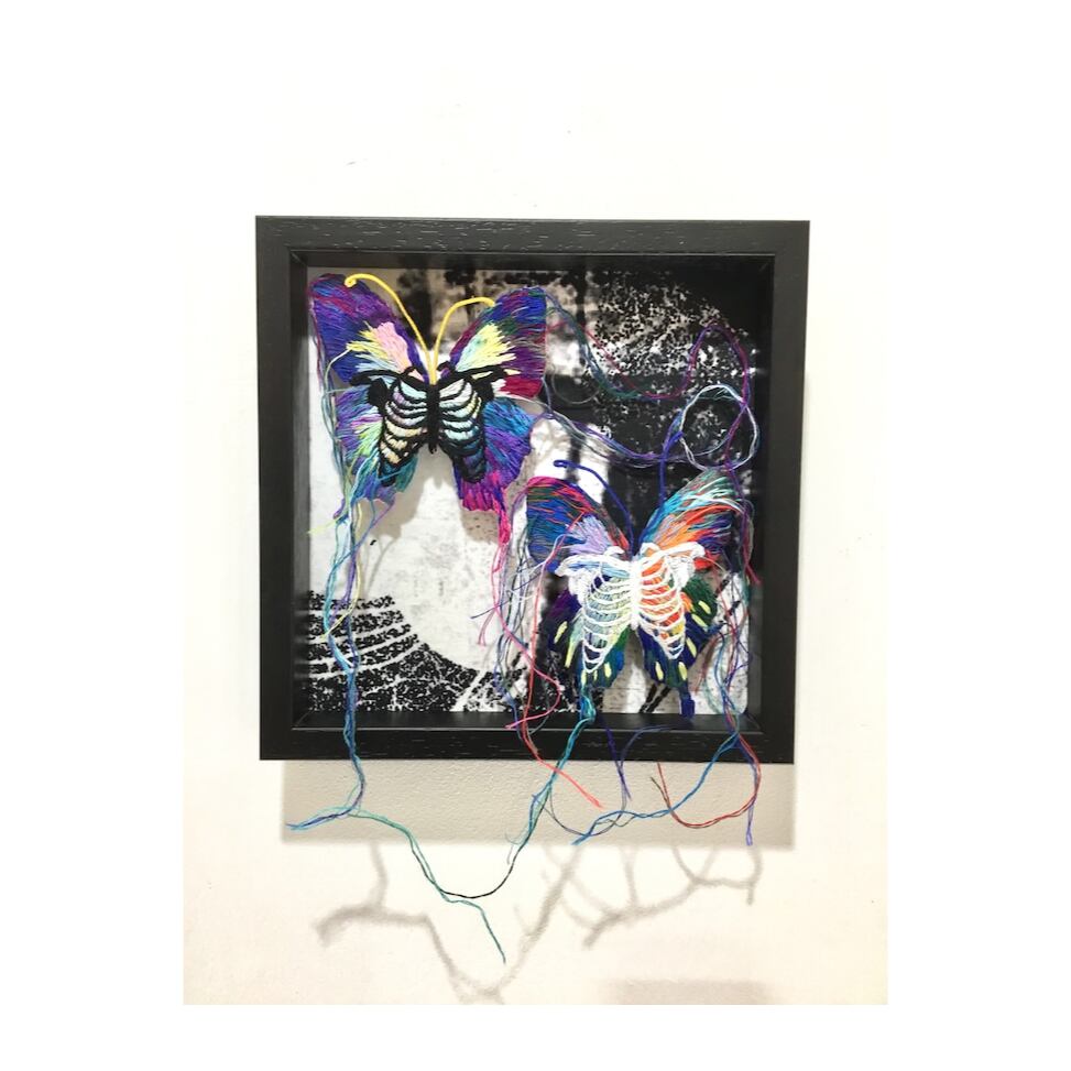 テキスタイル・ファッション領域を大学で学び刺繍、テキスタイル等を中心にコラージュなど幅広く表現するBEIの作品。主に「骨」を主題にして制作に取り組んでいる。自身のテキスタイル生地と刺繍を中心に制作した「アバラ蝶」はタイトルの通り人間の肋と蝶にインスピレーションを受けて制作した。シンボルとしての蝶は、人の霊が死後蝶に変わると言う逸話や、魂の象徴であると言われている。ビビッドで独特の色彩感覚が魅力的である。